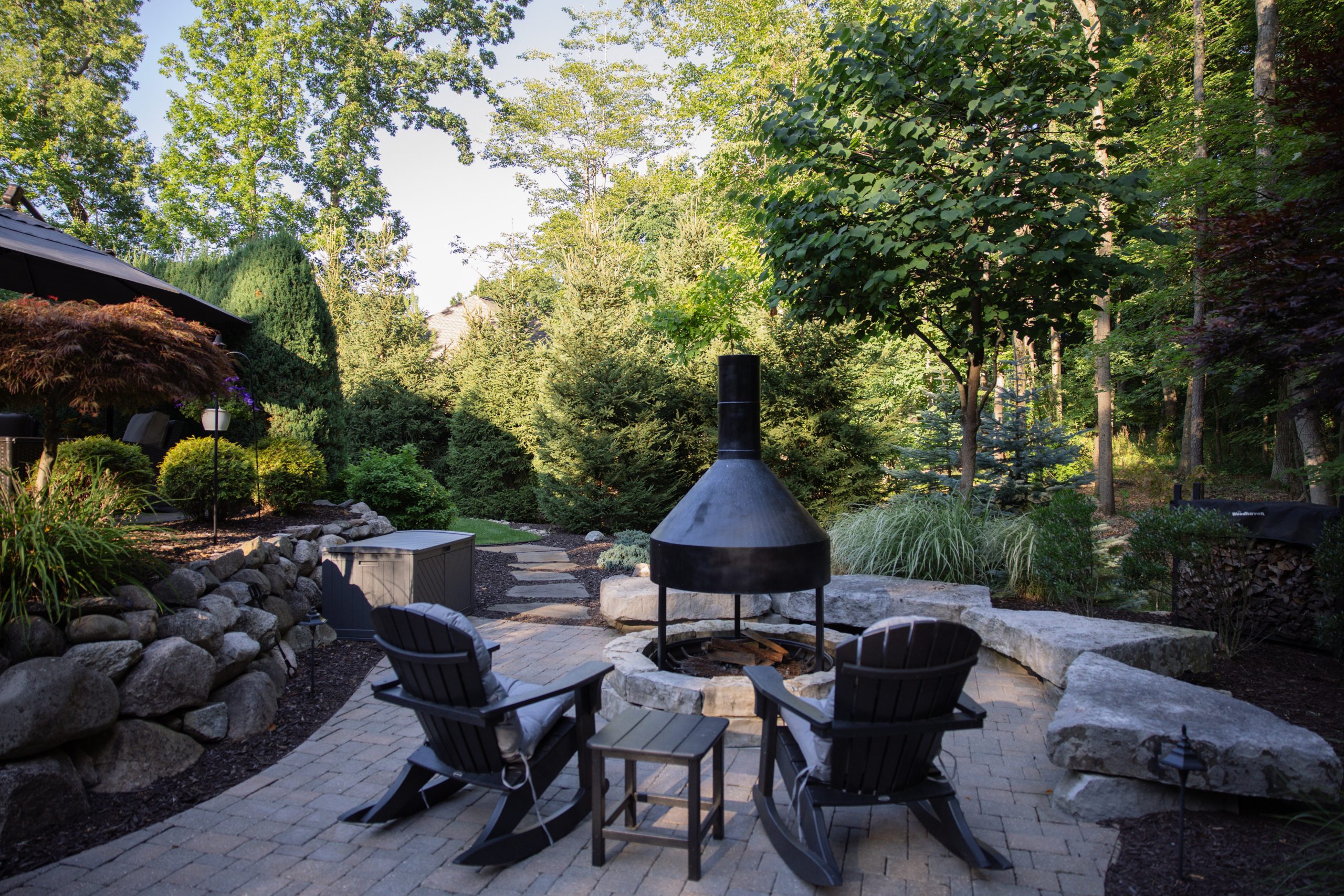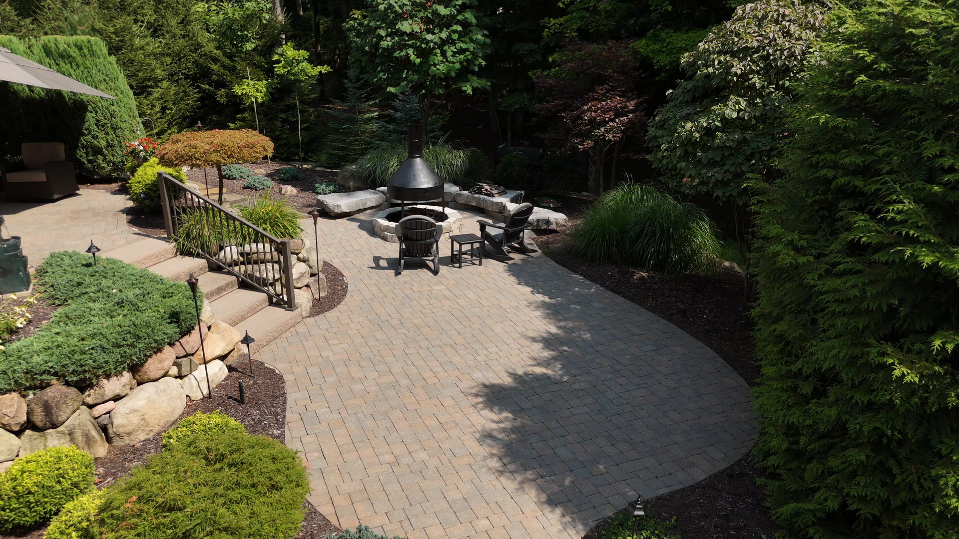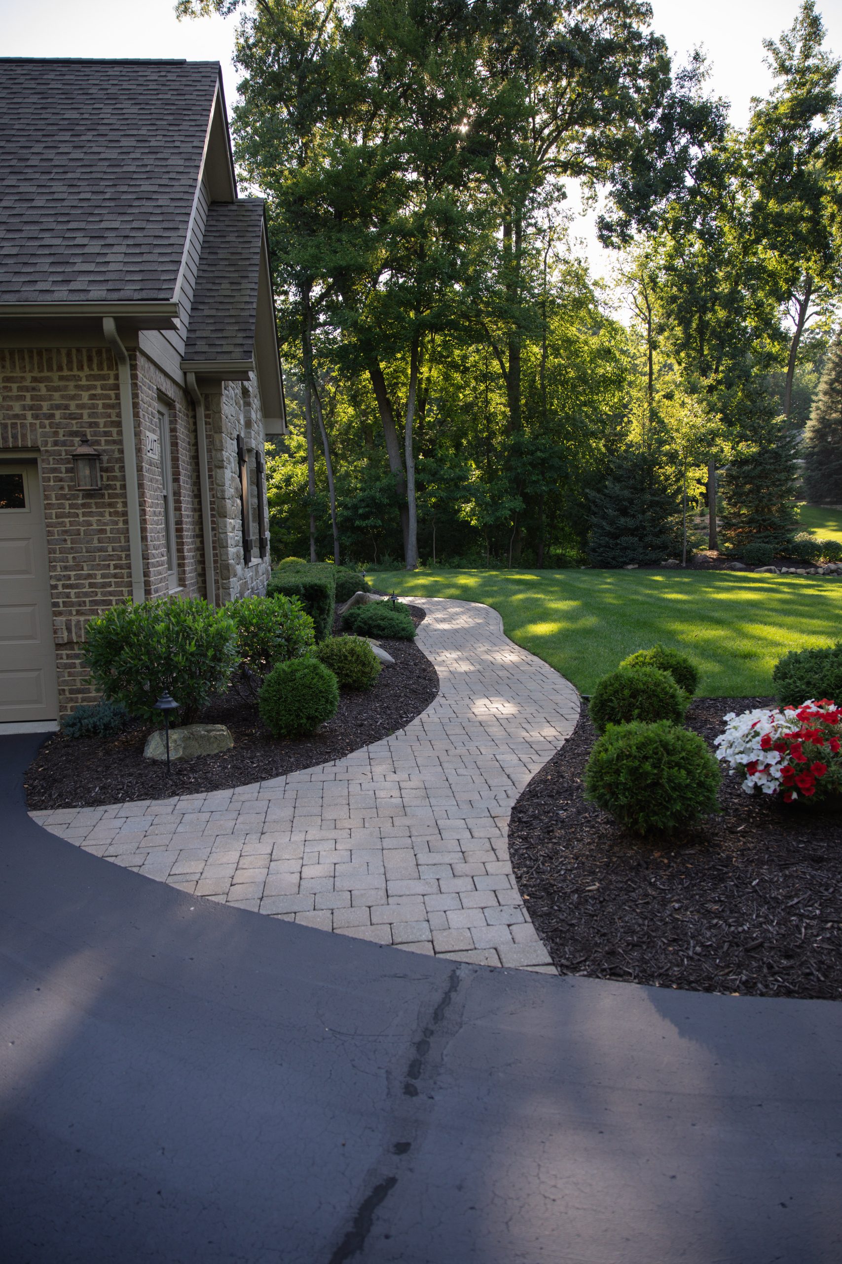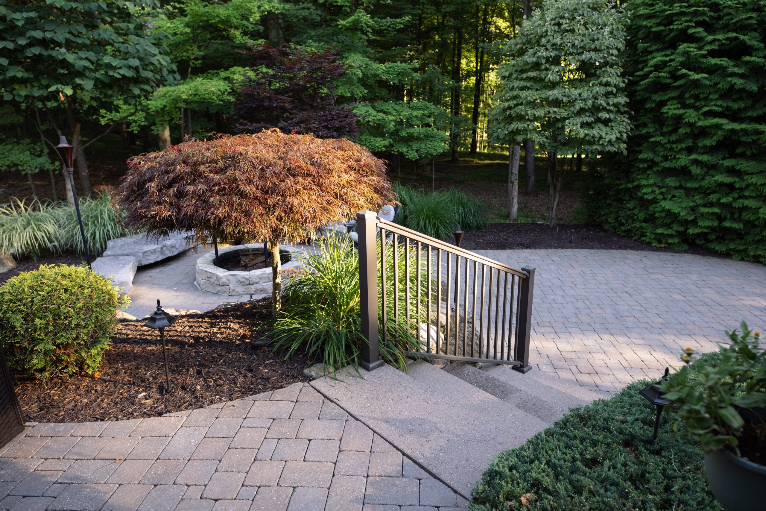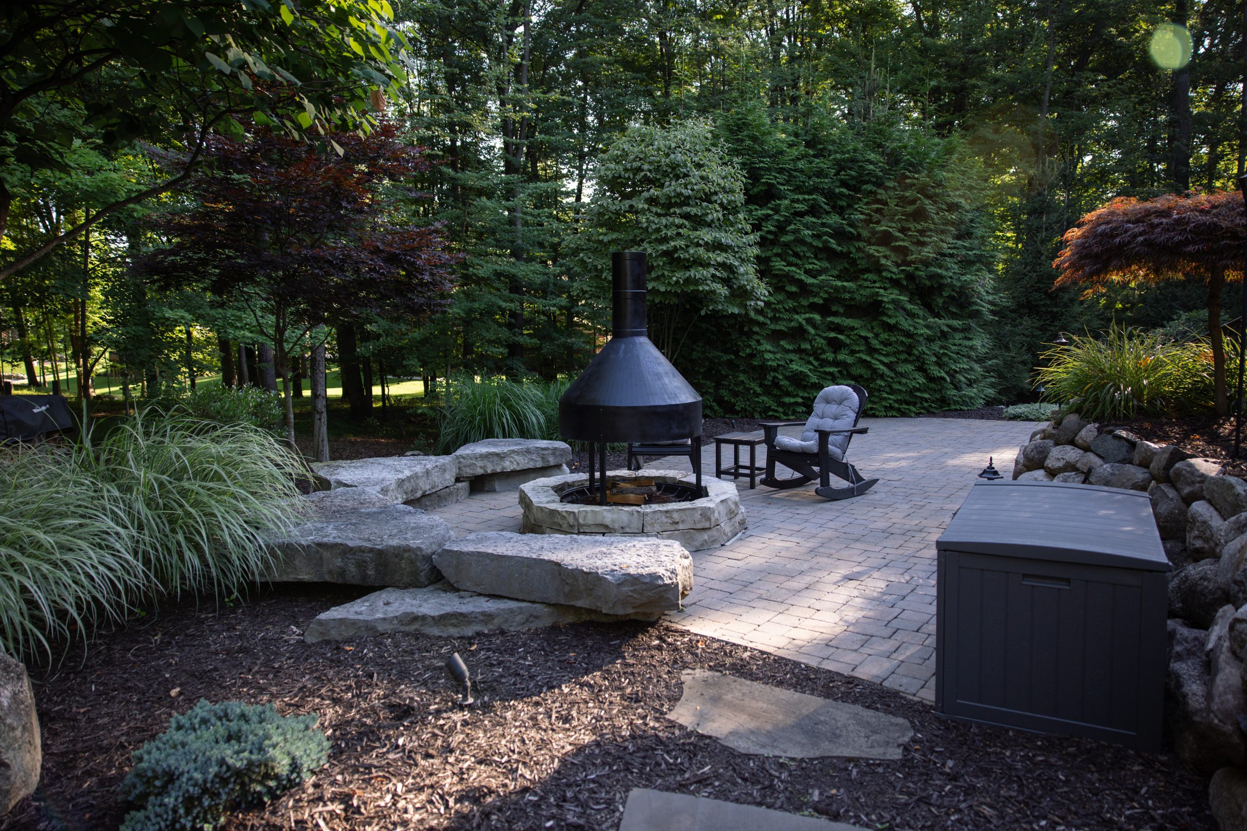 Paver Patio, Custom Firepit, Retaining Walls, Brick Paver Steps, Custom Landscape Design and Installation, Brick Paver Sidewalk, Night Lighting and Outdoor Living in Highland Township, MI.