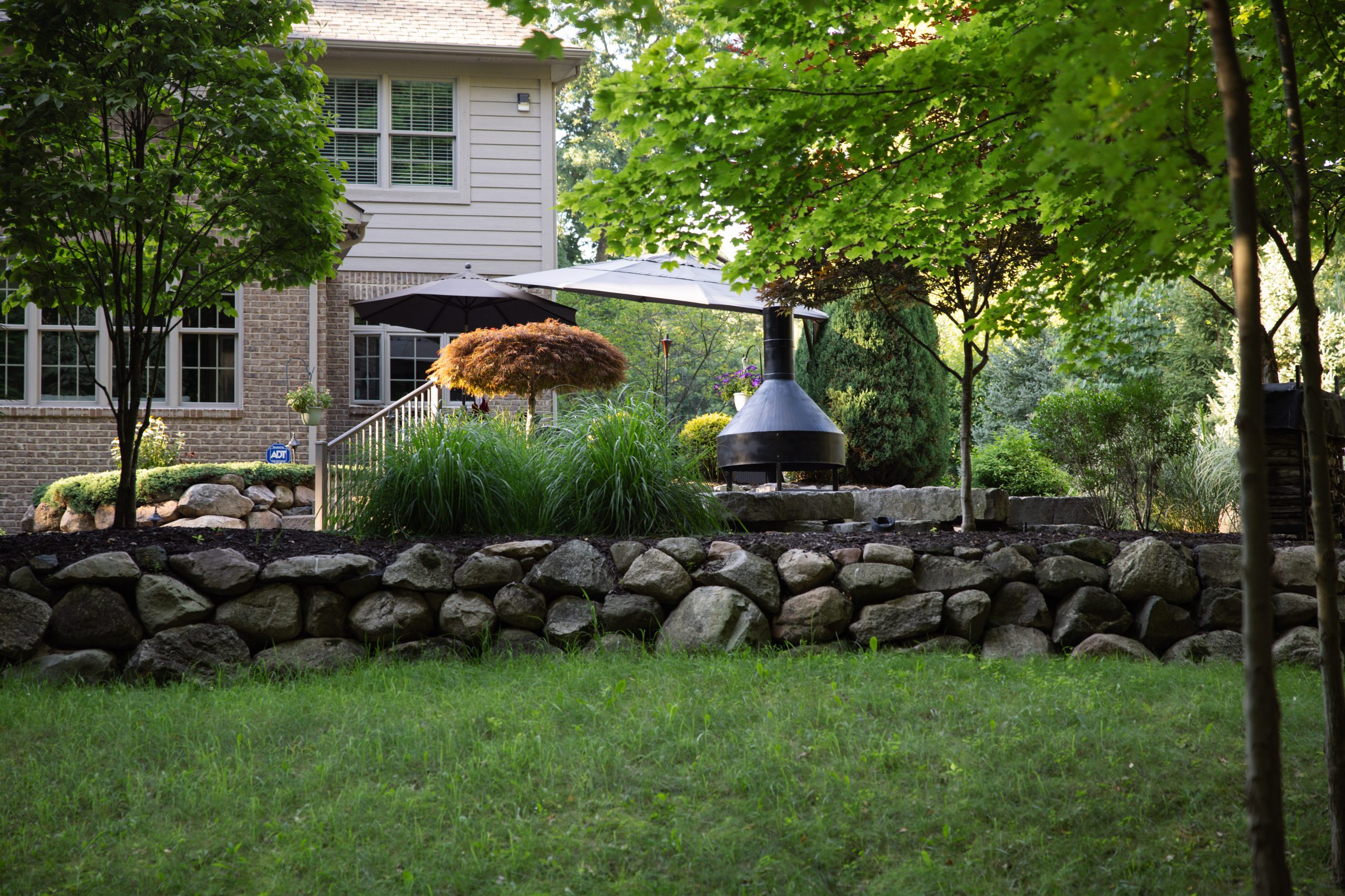 We created a design with several retaining walls using natural stone to hold up the brick paver patios. Two-tier paver patio was built to make the most use of the slope in the backyard and give them plenty of outdoor living space. Night lighting and plants & trees were installed to finish off the project.Features: