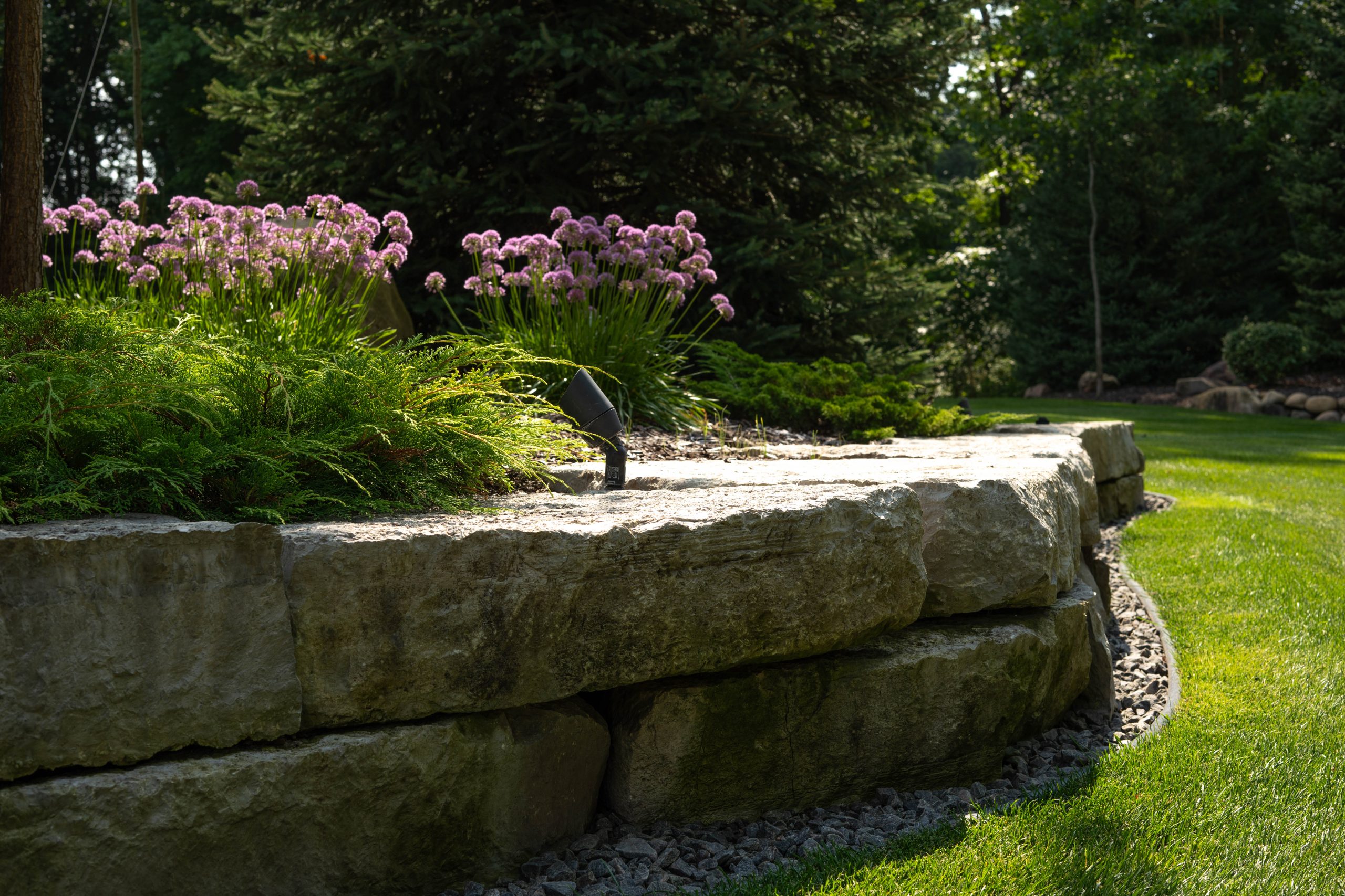 Natural Boulders & Montana Ledge Rock walls, Unilock Brussels Block (Coffee Creek Color), Custom built firepit and seating wall using ledge rock, Vista Night Lighting.Here’s what our clients say