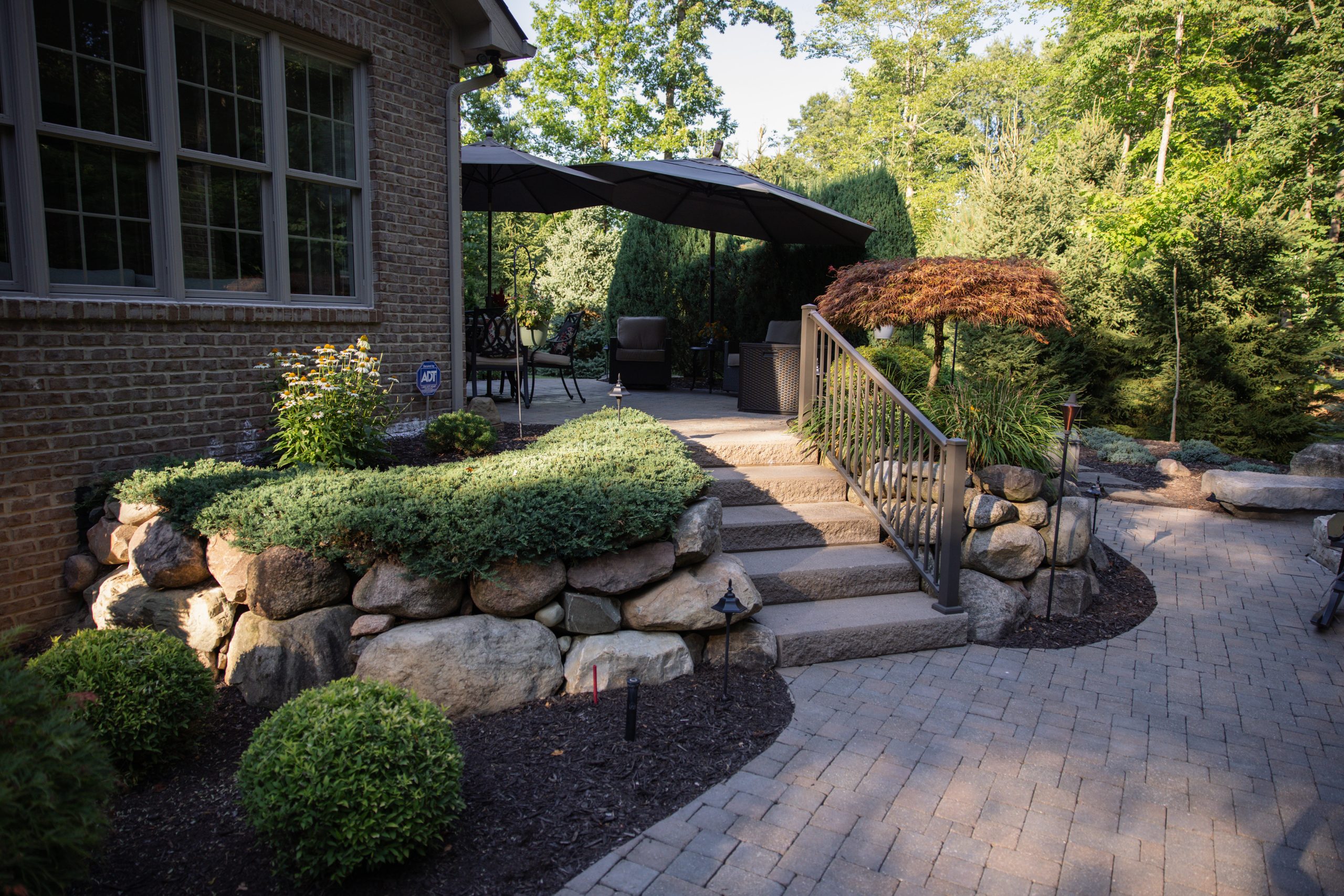 Patio, Staircase and Paver Porch, landscape lighting, landscape design & installation, natural stone retaining walls, wood burning firepit.Materials-