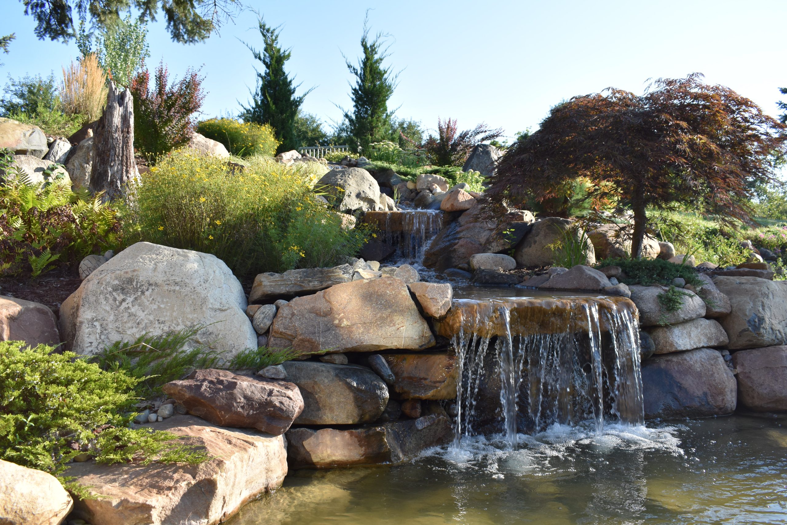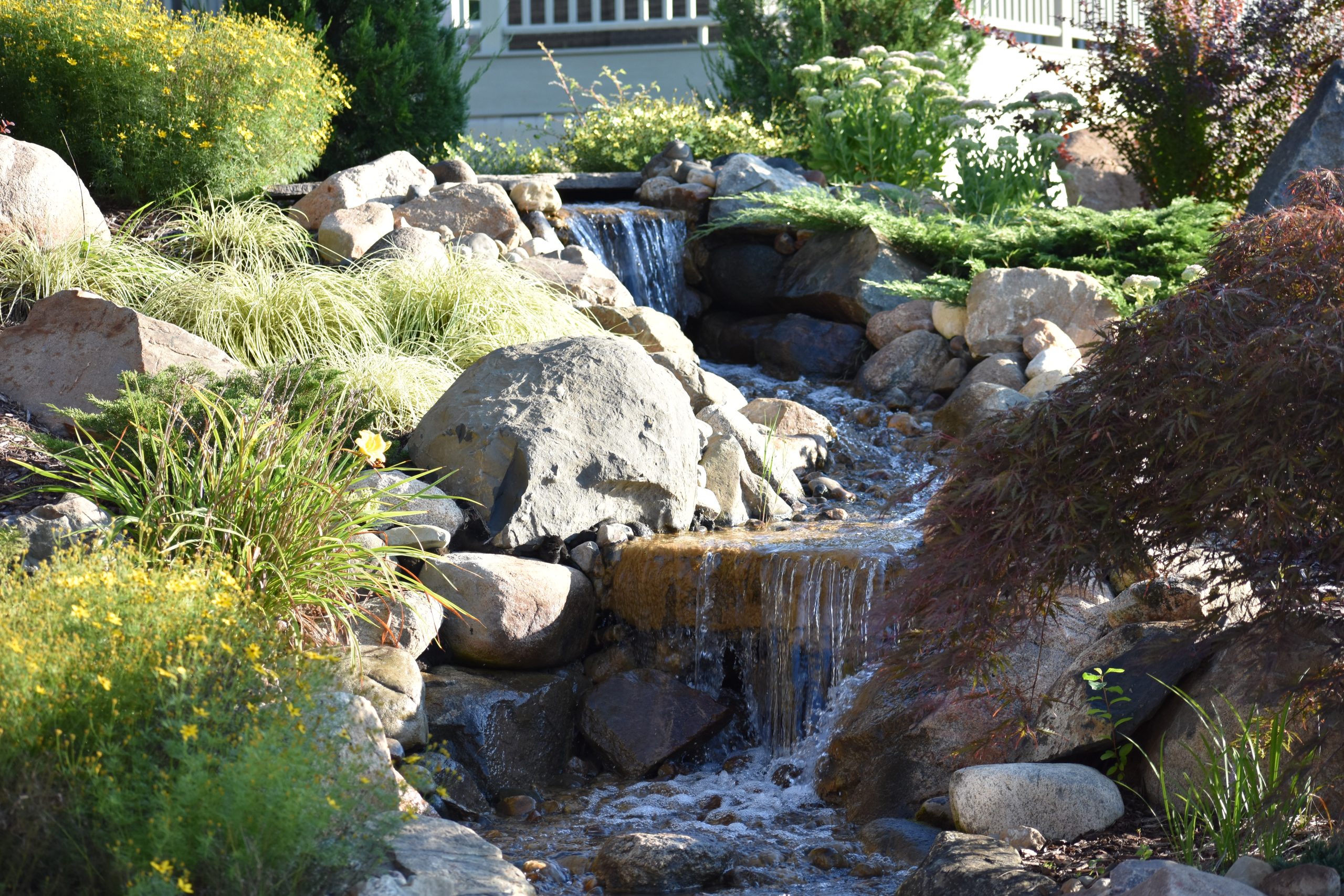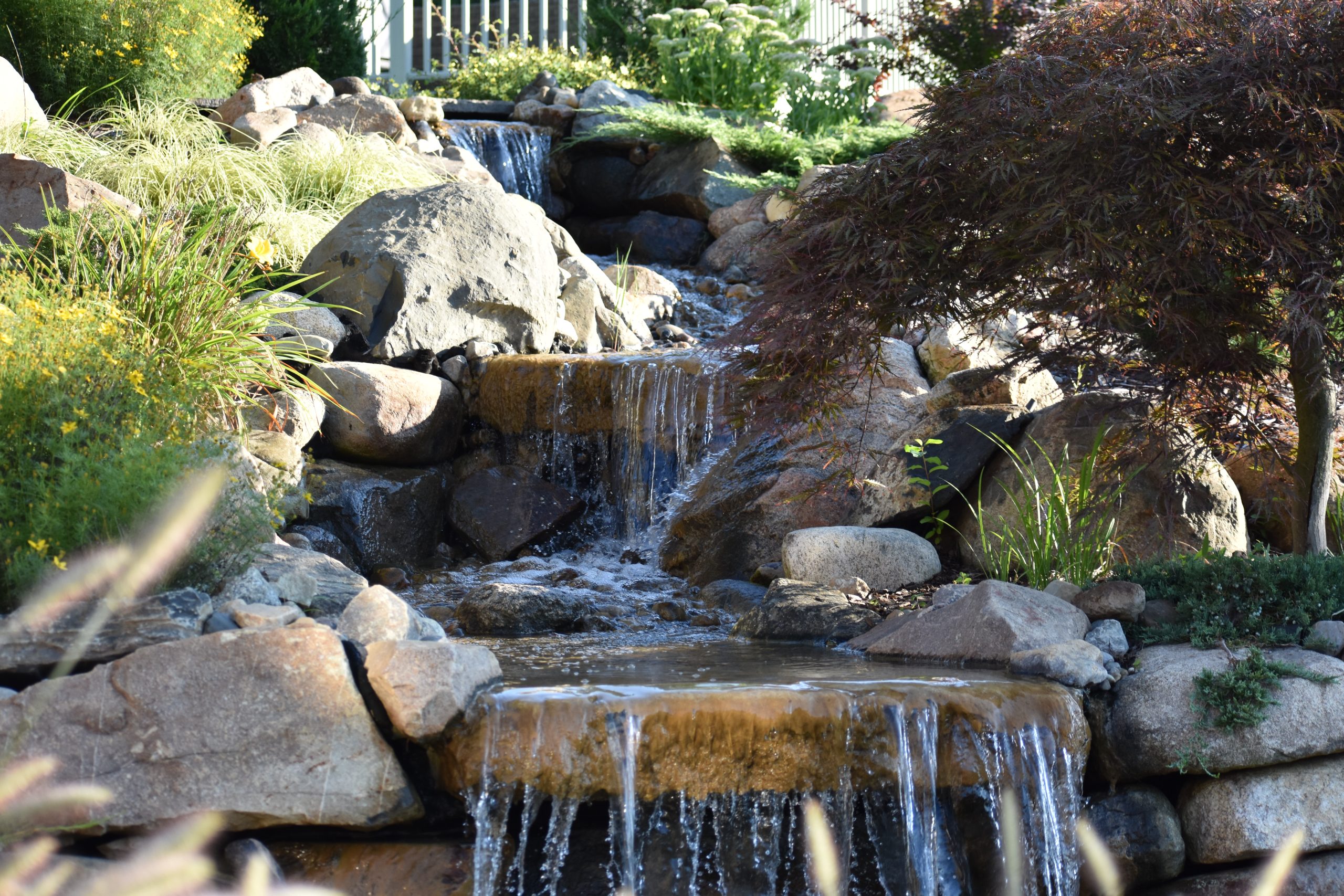 Waterfall, Stream, Water feature, Pond, aquascape planting.