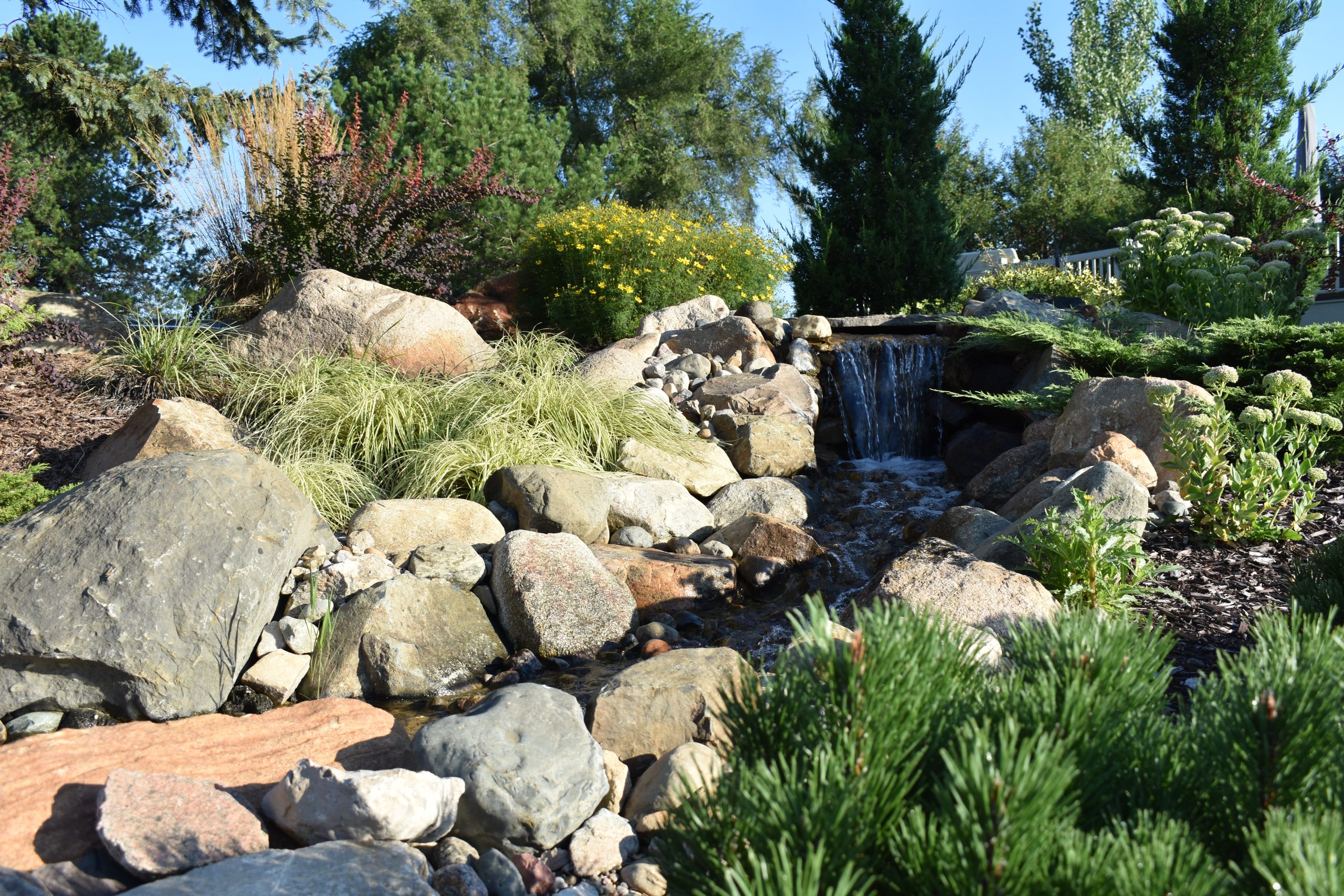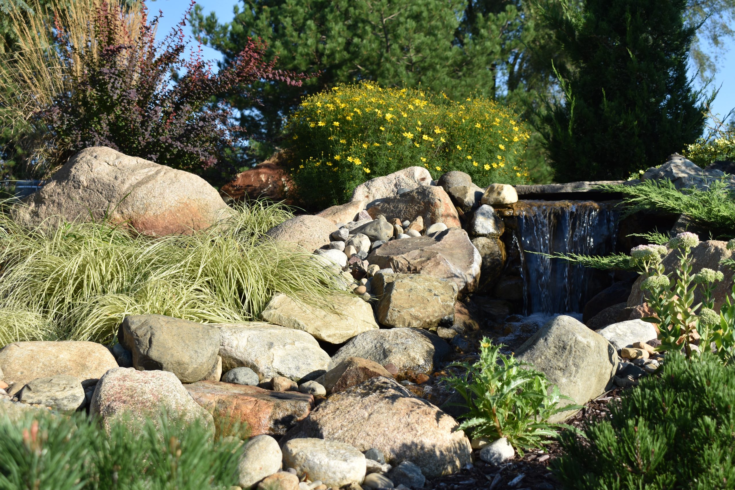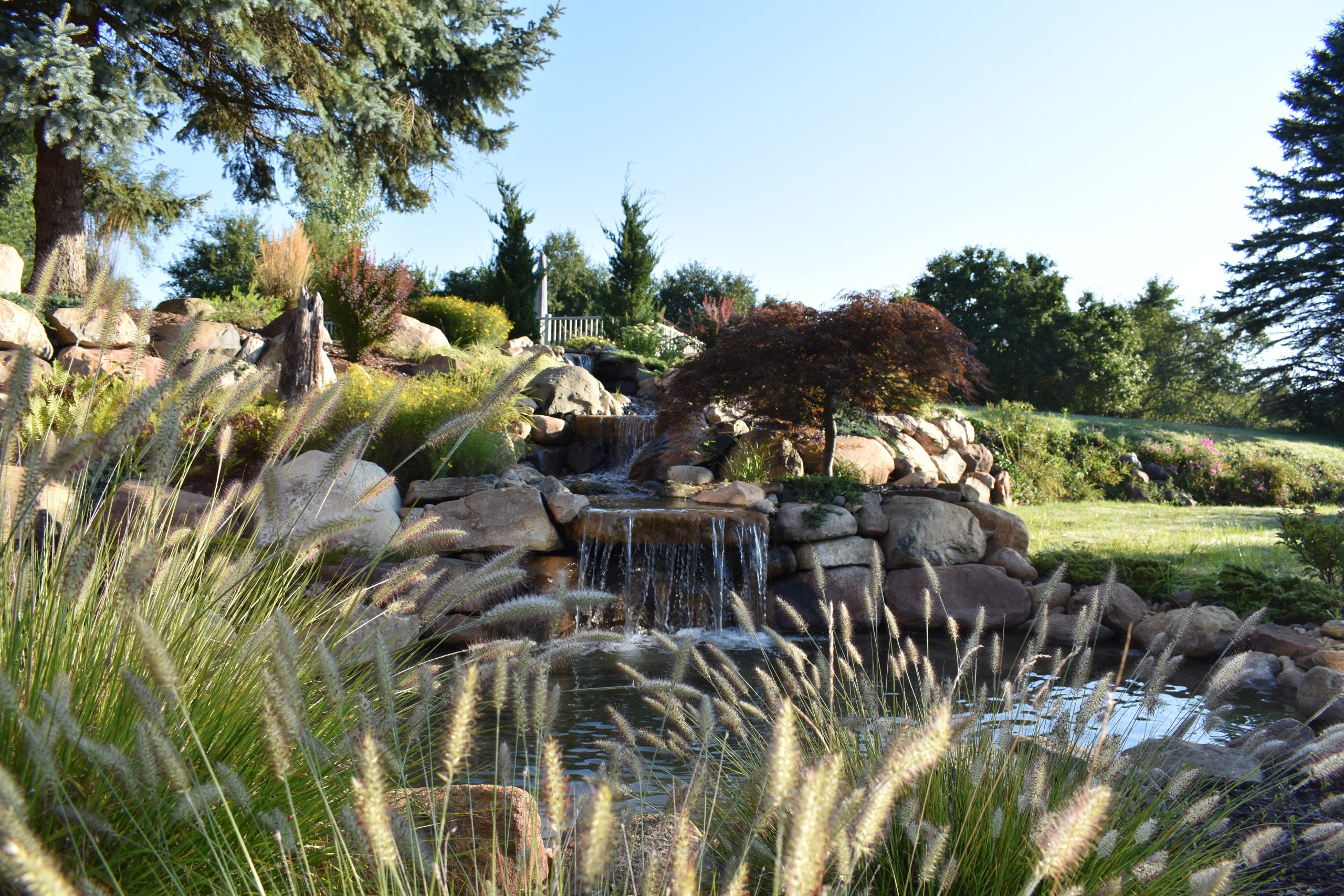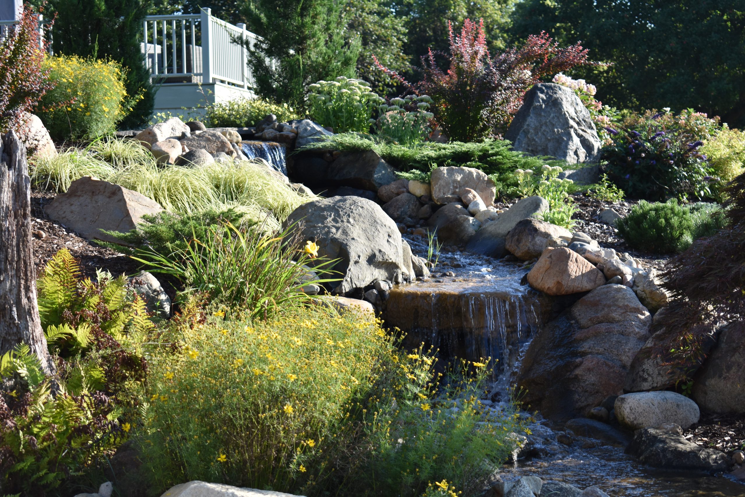 Waterfall, Stream, Water feature, Pond, aquascape planting.