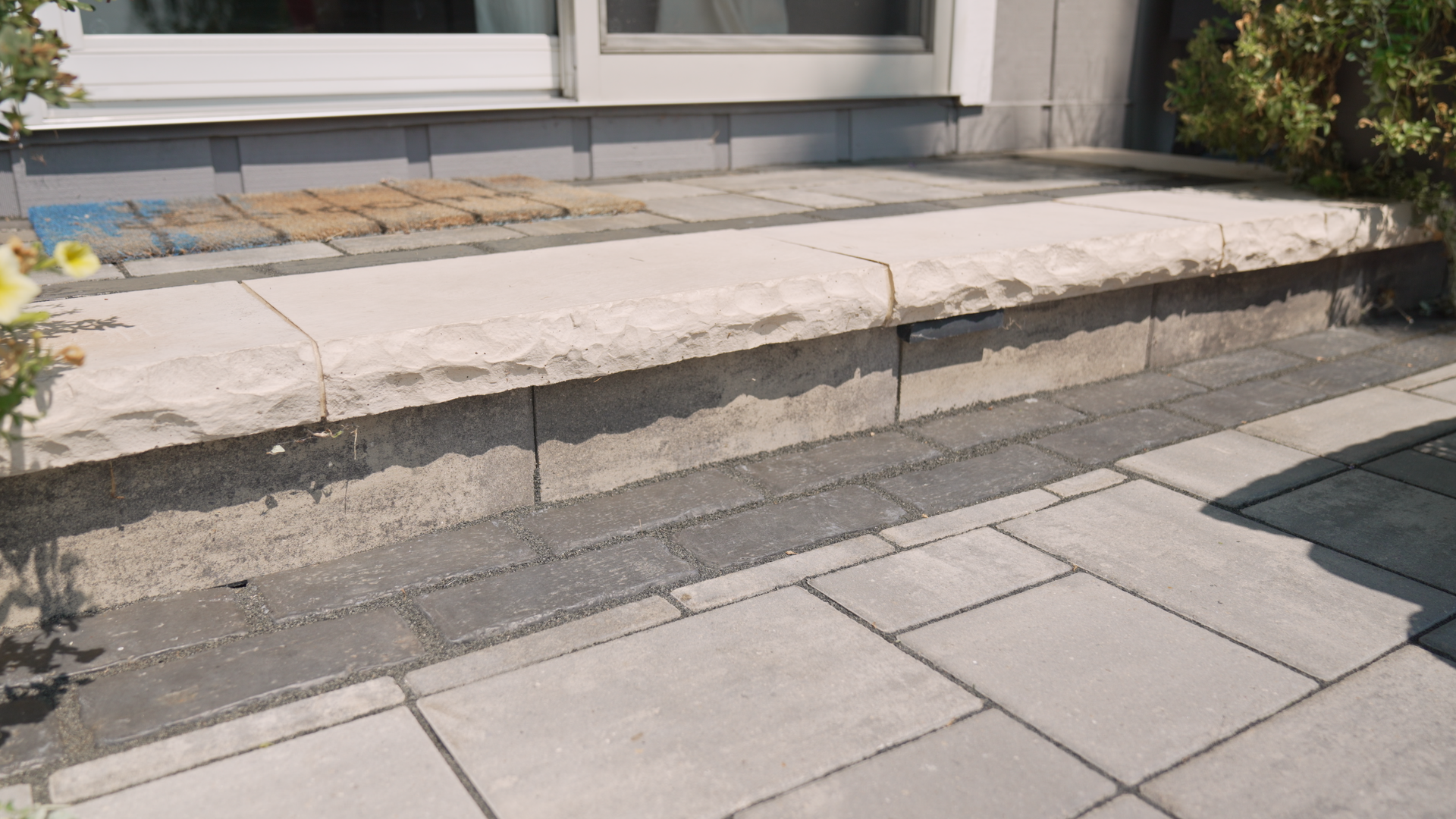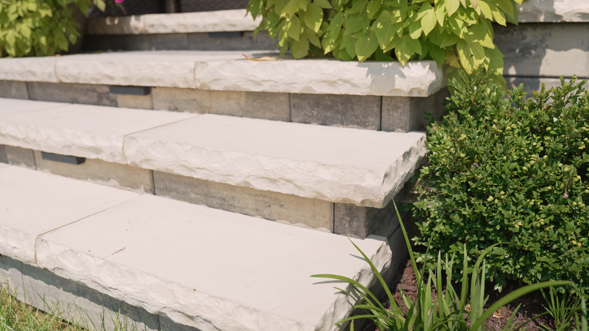 Unilock Treo Smooth Paver (Granite Color), Unilock Town Hall Paver (Basalt Color), Unilock U-Cara Wall System (Granite Color), Unilock Ledgestone Coping (Buff Color), Solos & Vista Landscape Lighting.