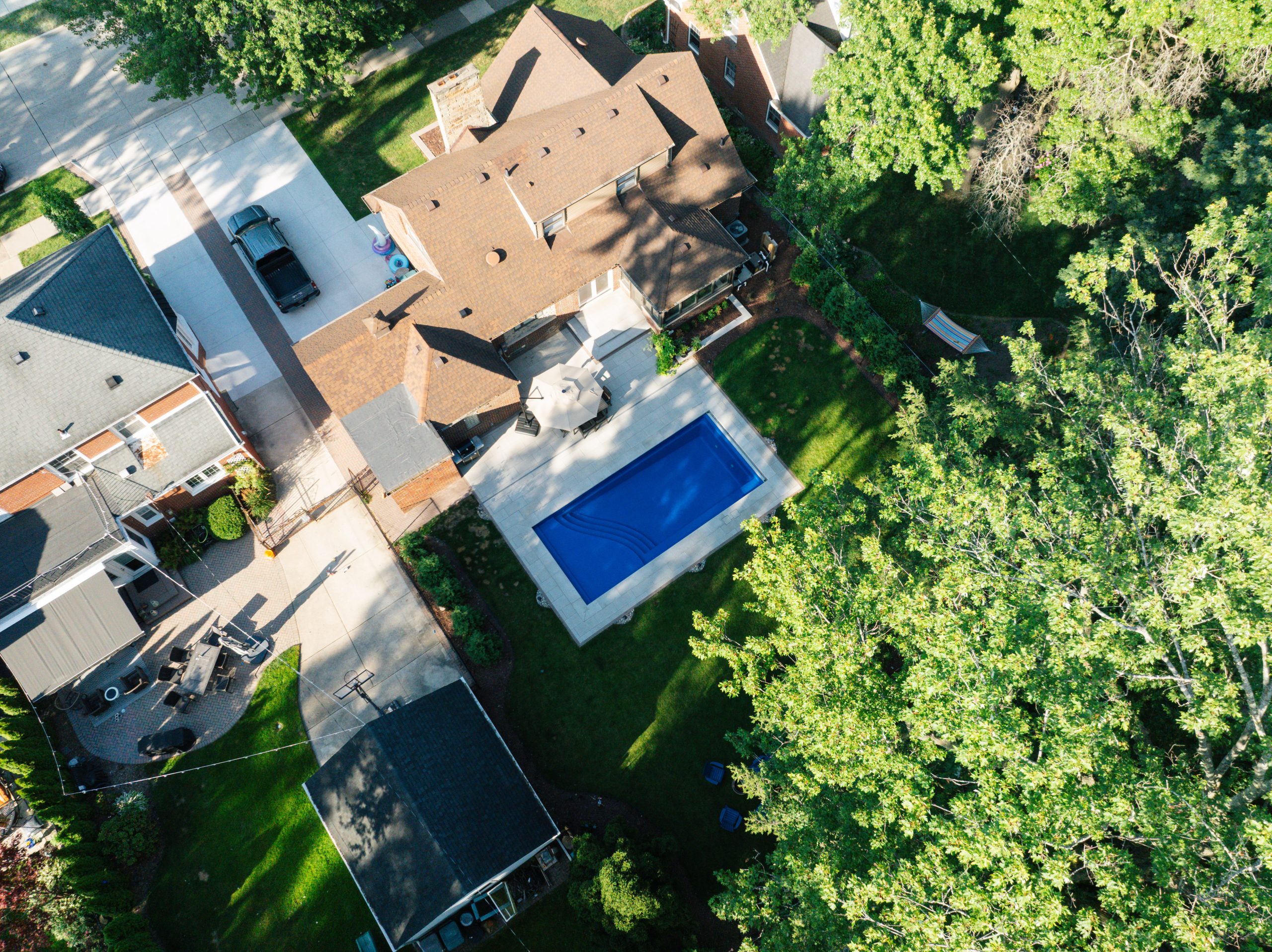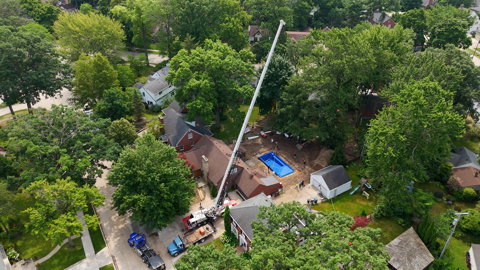 We went back and forth with the city and HOA for a few months to find a solution to make sure our client got a pool in their backyard. The neighbor was nice enough to let us use their driveway for nearly 2 months to get this pool in the ground. We had to hire a large 75 ton crane to hoist the pool shell over the house from the street to get it into the backyard. We were very restricted on the coverage, so we had to find a pool that was big enough for them to enjoy but not jeopardize the patio space around the pool.